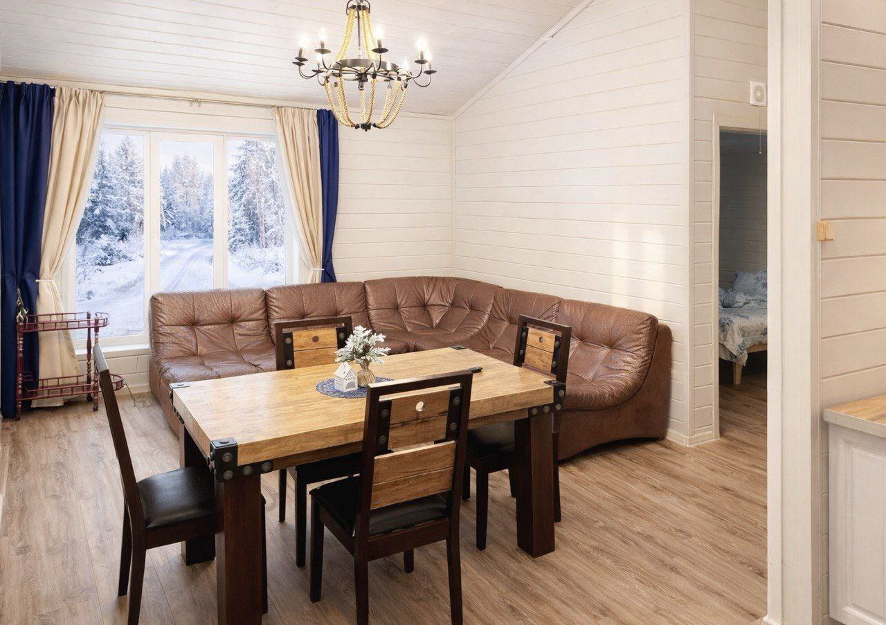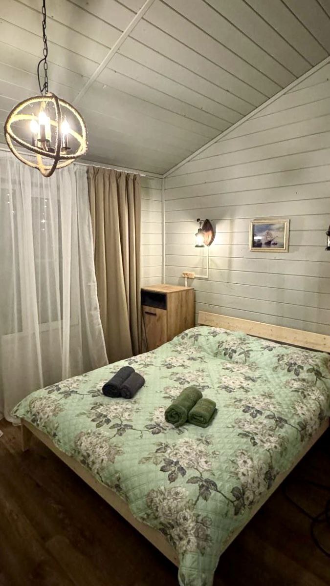 Две спальни, большая гостиная с панорамными окнами, большим удобным диваном, камином, телевизором, совмещенная с кухней (холодильник, чайник, микроволновая печь, плита), санузел, большая веранда с садовой мебелью, мангал.