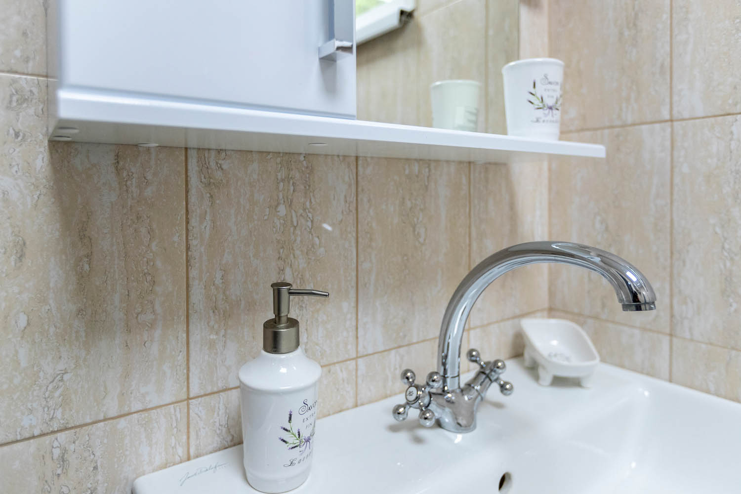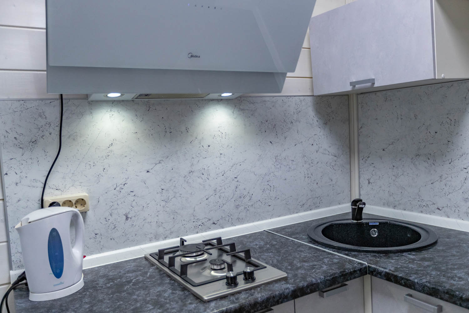 Санузел, прихожая, гостиная (раскладывающийся диван, телевизор, обеденный стол), совмещенная с кухней (газовая плита, холодильник, микроволновая печь, чайник, необходимая посуда), спальня (двуспальная кровать, шкафы, тумбы).